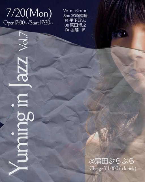 | 出演 | ma⭐︎rron(小嶋希代子)(Vo) https://www.instagram.com/marron.ronron/ 原田博之(Bs) https://www.instagram.com/haradahryk/ https://www.facebook.com/hiroyuki.harada.543 宮崎隆睦(Sax) https://miyazaki-sax.com/ 平下政志(Key) https://www.facebook.com/masashi.hirashita 堀越彰(Drs) |