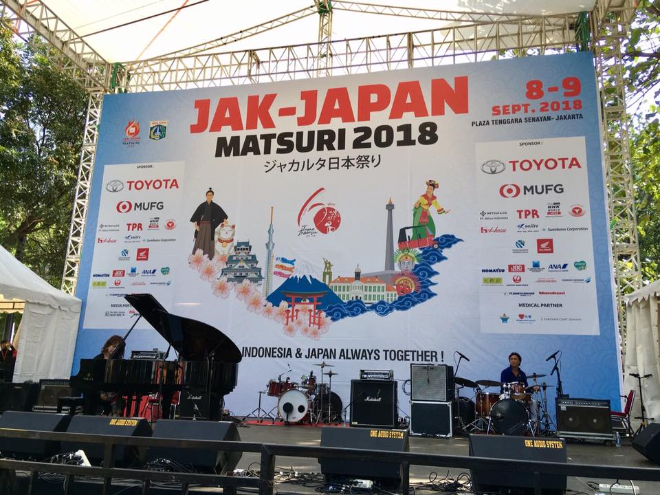 その年、もう一度今度は日本とインドネシアの国交50周年を記念したイベントに、スキマスイッチ、キロロ、AKB48とそのジャカルタ版 JKT48と共に参加しました。とても光栄で楽しみな海外フェスへの参加で盛り上がりました ! まー、頭の片隅には、いくつかの不安材料は解決されぬままでしたが・・・。まずはグランドピアノがちゃんと届くか!? 届かなかったらドラムソロ??? 本当にありえない話しじゃない、って感じで、とても心配でした。ちなみにグランドピアノを使うのはOBSESSIONだけです。会場に着いたら置いてあってホッとしました。リハーサルもなく、サウンドチェックも本番の直前の5分くらい、ピアノとドラムは巨大な野外ステージの端と端、OBSESSION史上最も離れて演奏したのがこの日でした。モニターからは爆音でピアノが返っている。ドラムセットは3セットあるものから「これを使え」と言われて見たらボロボロのセット! バスドラムのヘッドなんか破れかけててハラハラしました。まーそんな経験を出来たのも、今となれば楽しい思い出です。