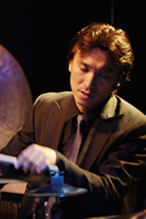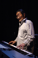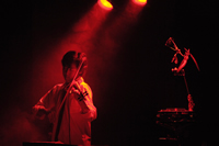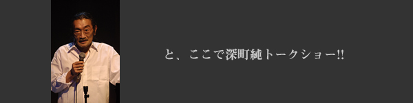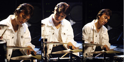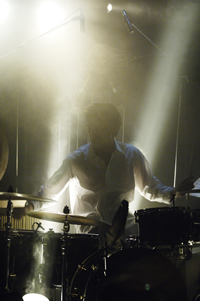 | 2 Drum Solo Truth (Akira Horikoshi) 4種類のSEを使う、僕の新曲です。「僕の背後に歴史の明暗を見続けてきたかのような力の均衡を保とうとするオブジェが煙の中に浮かび上がる。」なんて照明プランを出したら、マンダラの照明担当 小宮さんが張り切ってくれました。僕もドラムを叩きながら「一体何が起こってるんだ!」と思うほどの照明が上から下から背後から、「僕が見えないんじゃない?」と心配になるほどの大量の煙に「ちょっと撮影は困るなぁ」って感じのストロボ連発で幻想的な世界を作つくっていただきました。小宮さん、ありがとうございました。次回も指名させていただきます。音と同時に姿も消えてた・・・なんて演出をしたら、イリュージョンですよね。 |