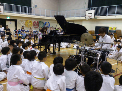 東京都内を中心に5支部150人の門下生を抱えている心拳法は、青少年育成と人格形成を主眼に強くて優しい人間作りを目標としています。 世田谷区希望ヶ丘小学校の体育館で行われた設立15周年記念大会で、ピアノの三舩優子さんとともに間近で迫力ある演奏を披露しました。